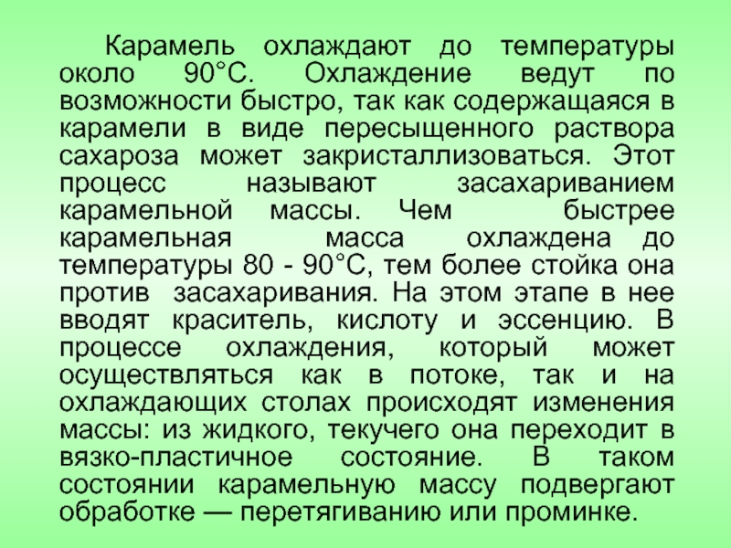 так как содержащаяся в карамели в виде пересыщенного раствора сахароза может закристаллизоваться. Этот процесс называют засахариванием карамельной массы. Чем быстрее карамельная масса охлаждена до температуры 80 - 90°С, тем более стойка она против засахаривания. На этом этапе в нее вводят краситель, кислоту и эссенцию. В процессе охлаждения, который может осуществляться как в потоке, так и на охлаждающих столах происходят изменения массы: из жидкого, текучего она переходит в вязко-пластичное состояние. В таком состоянии карамельную массу подвергают обработке — перетягиванию или проминке.