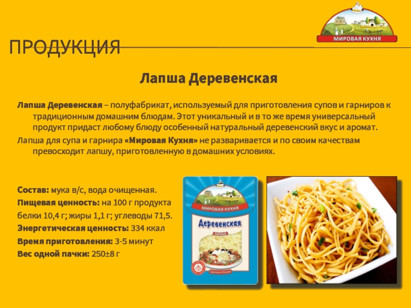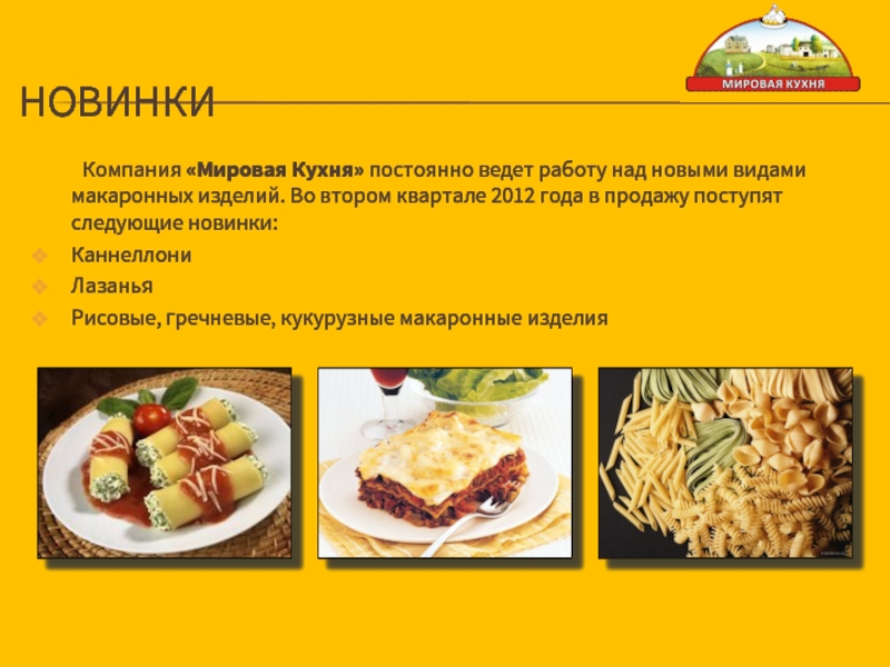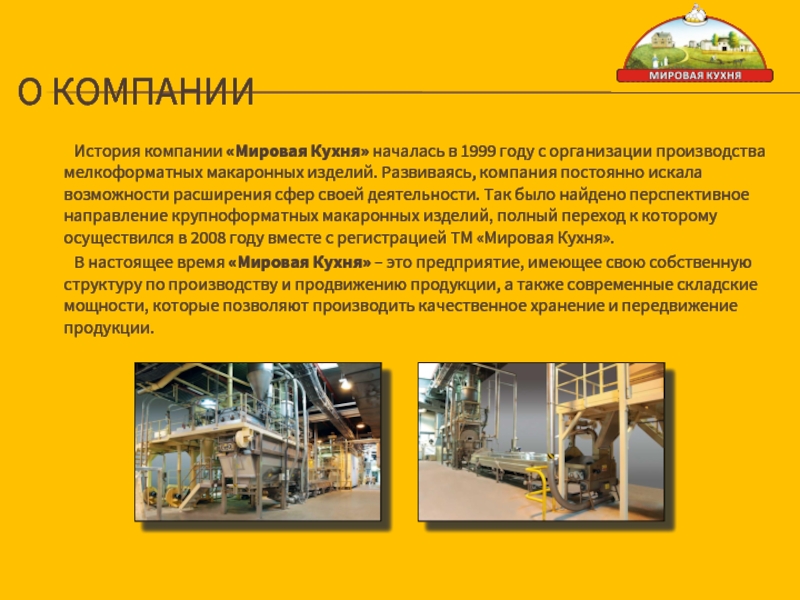 производства мелкоформатных макаронных изделий. Развиваясь, компания постоянно искала возможности расширения сфер своей деятельности. Так было найдено перспективное направление крупноформатных макаронных изделий, полный переход к которому осуществился в 2008 году вместе с регистрацией ТМ «Мировая Кухня».