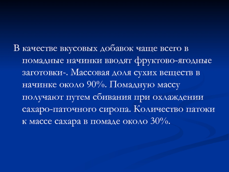 заготовки-. Массовая доля сухих веществ в начинке около 90%. Помадную массу получают путем сбивания при охлаждении сахаро-паточного сиропа. Количество патоки к массе сахара в помаде около 30%.
