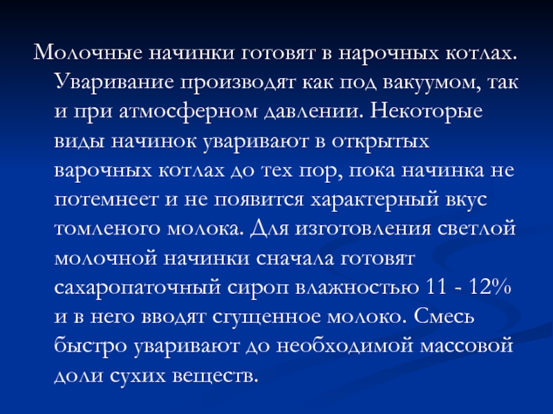Слайд 14Молочные начинки готовят в нарочных котлах. Уваривание производят как под вакуумом,