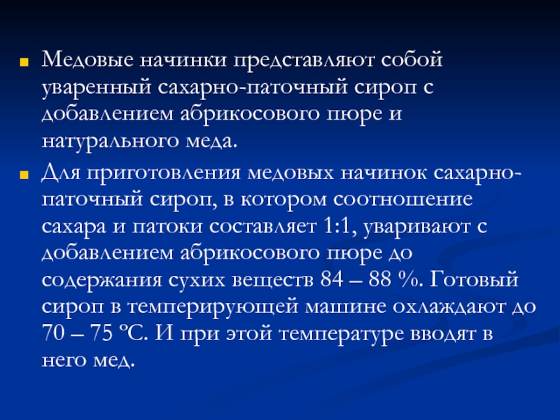 Слайд 9Медовые начинки представляют собой уваренный сахарно-паточный сироп с добавлением абрикосового пюре