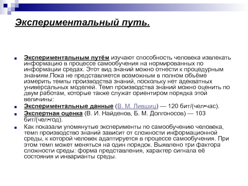 самообучения на нормированных по информации средах. Этот вид знаний можно отнести к процедурным знаниям.Пока не представляется возможным в полном объёме измерить темпы производства знаний, поскольку нет адекватных универсальных моделей. Темп производства знаний можно оценить по двум работам, которые также служат ориентиром порядка этой величины: