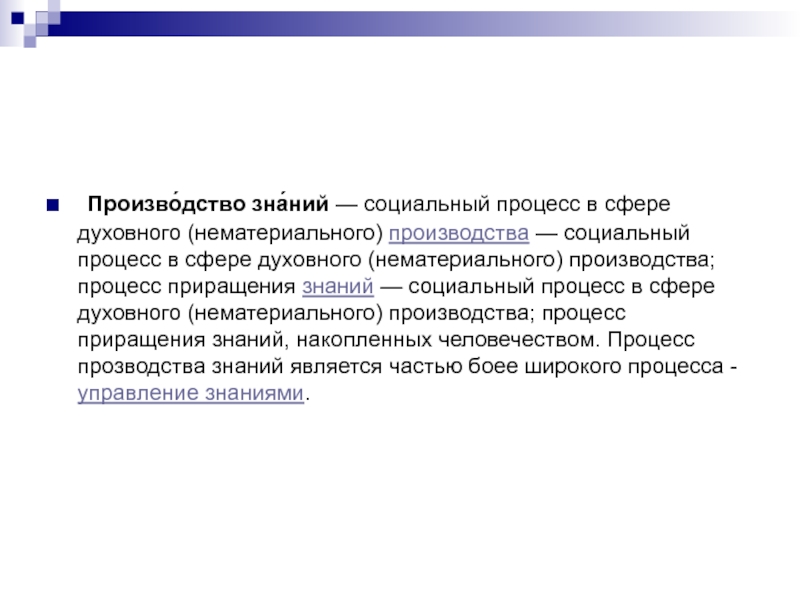 — социальный процесс в сфере духовного (нематериального) производства; процесс приращения знаний — социальный процесс в сфере духовного (нематериального) производства; процесс приращения знаний, накопленных человечеством. Процесс прозводства знаний является частью боее широкого процесса - управление знаниями.