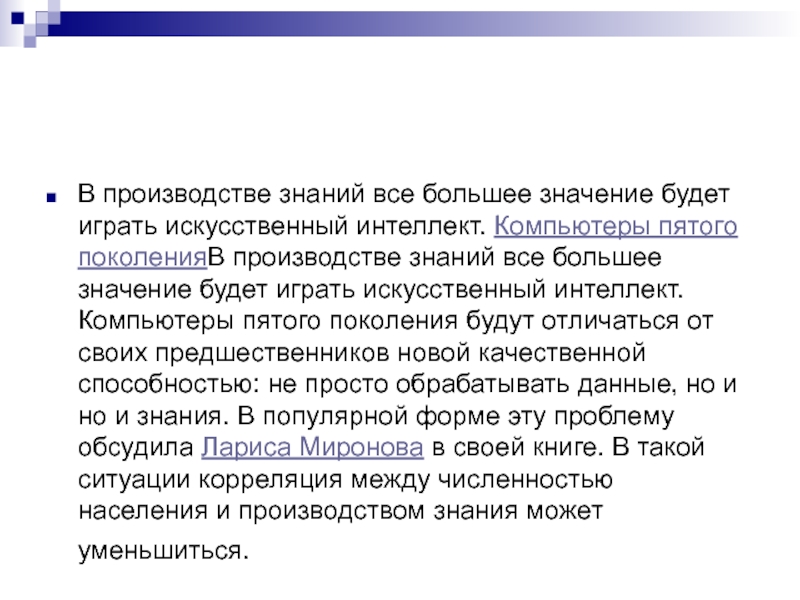 пятого поколенияВ производстве знаний все большее значение будет играть искусственный интеллект. Компьютеры пятого поколения будут отличаться от своих предшественников новой качественной способностью: не просто обрабатывать данные, но и но и знания. В популярной форме эту проблему обсудила Лариса Миронова в своей книге. В такой ситуации корреляция между численностью населения и производством знания может уменьшиться.
