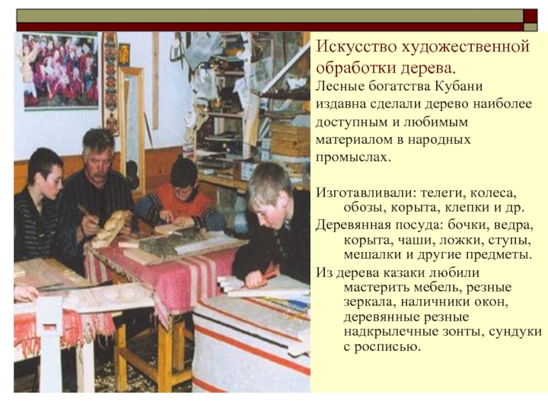 Из дерева казаки любили мастерить мебель, резные зеркала, наличники окон, деревянные резные надкрылечные зонты, сундуки с росписью.