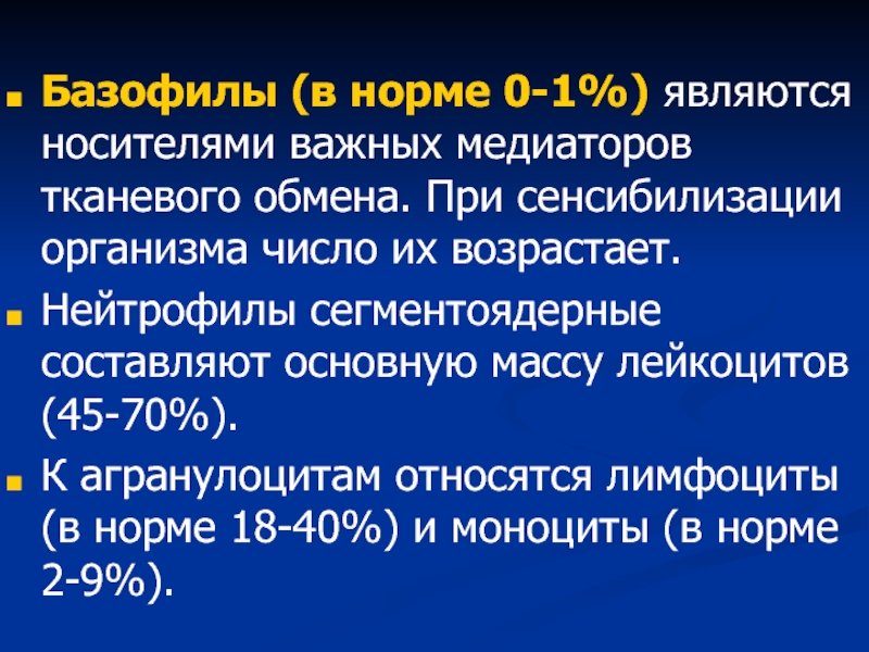 Базофилы (в норме 0-1%) являются носителями важных медиаторов тканевого обмена. При