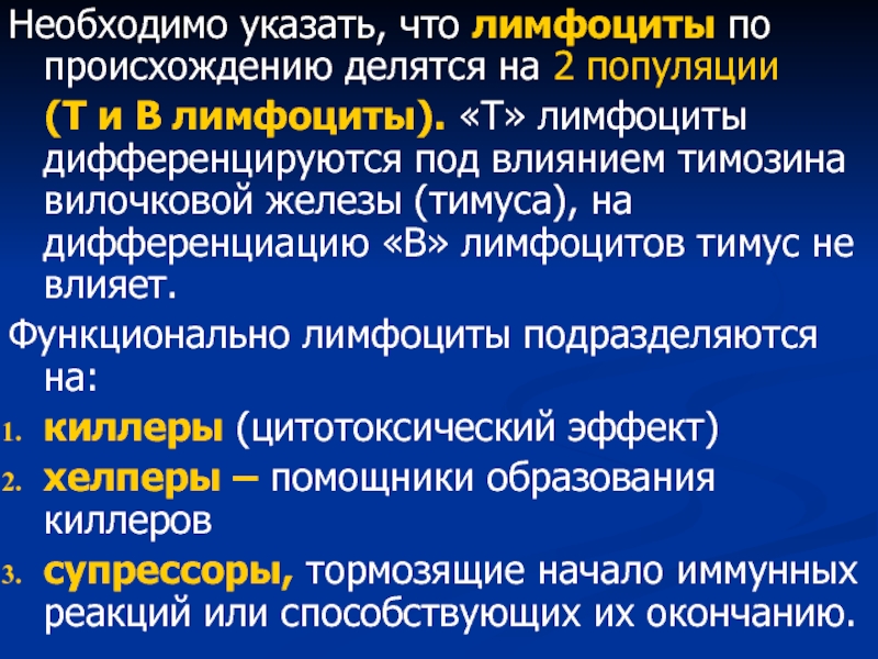 Слайд 34Необходимо указать, что лимфоциты по происхождению делятся на 2 популяции