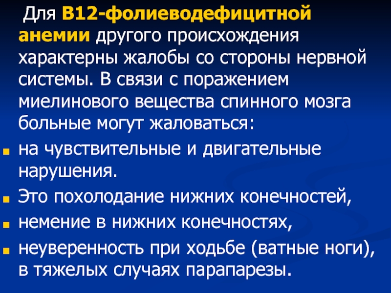 Слайд 11 Для В12-фолиеводефицитной анемии другого происхождения характерны жалобы со стороны нервной системы.
