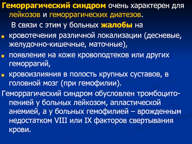 Геморрагический синдром обусловлен тромбоцито-пенией у больных лейкозом, апластической анемией, а у больных гемофилией – врожденным недостатком VIII или IX факторов свертывания крови.