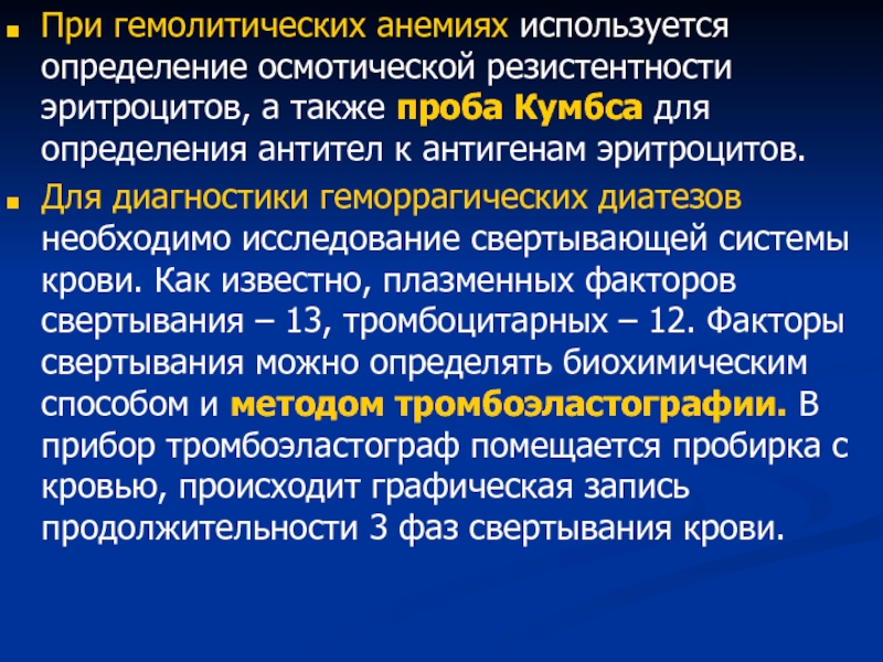 Слайд 39При гемолитических анемиях используется определение осмотической резистентности эритроцитов, а также проба