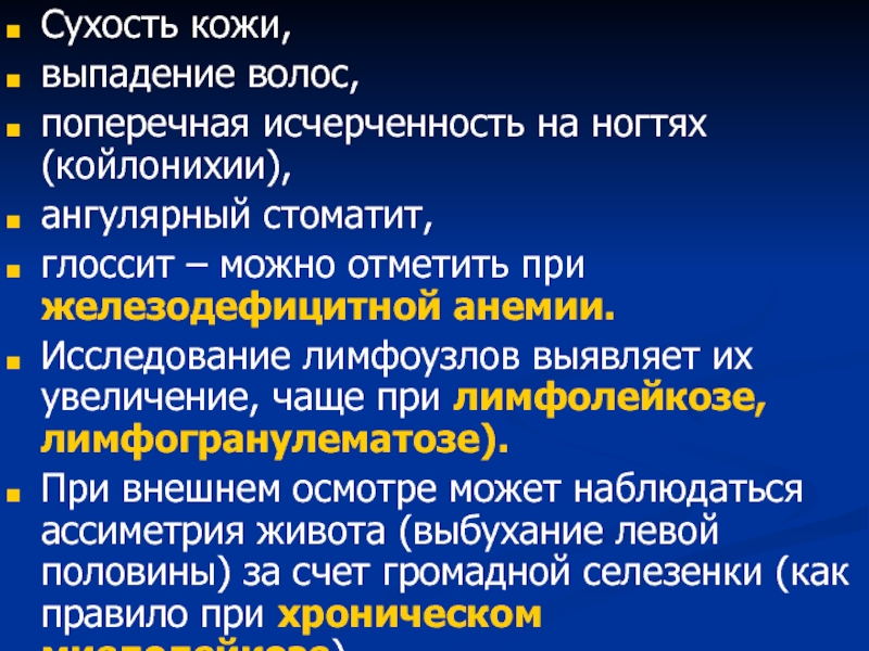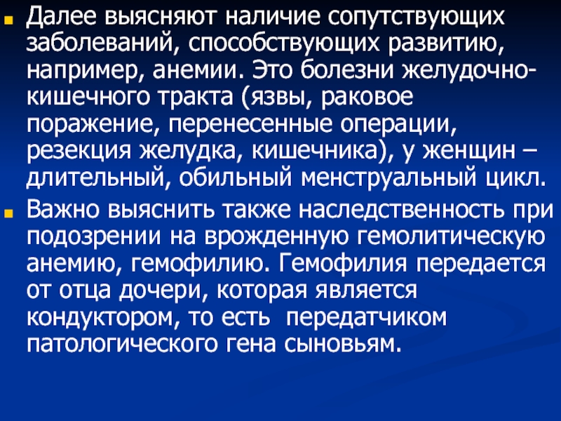 Слайд 13Далее выясняют наличие сопутствующих заболеваний, способствующих развитию, например, анемии. Это болезни