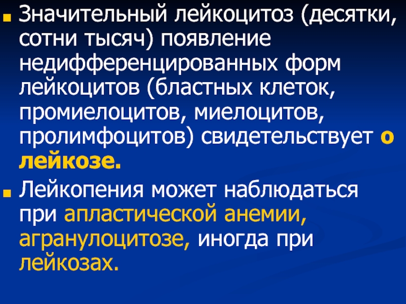 Слайд 30Значительный лейкоцитоз (десятки, сотни тысяч) появление недифференцированных форм лейкоцитов (бластных клеток,