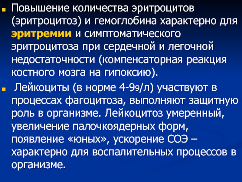 Слайд 29Повышение количества эритроцитов (эритроцитоз) и гемоглобина характерно для эритремии и симптоматического