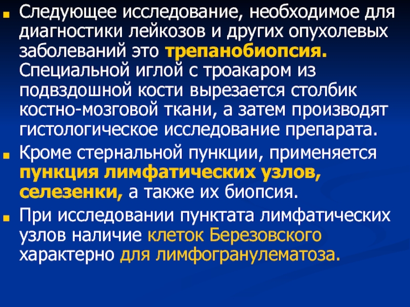 Слайд 38Следующее исследование, необходимое для диагностики лейкозов и других опухолевых заболеваний это
