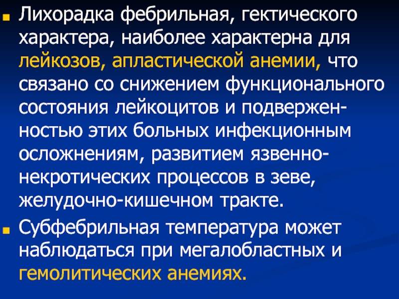 Слайд 7Лихорадка фебрильная, гектического характера, наиболее характерна для лейкозов, апластической анемии, что