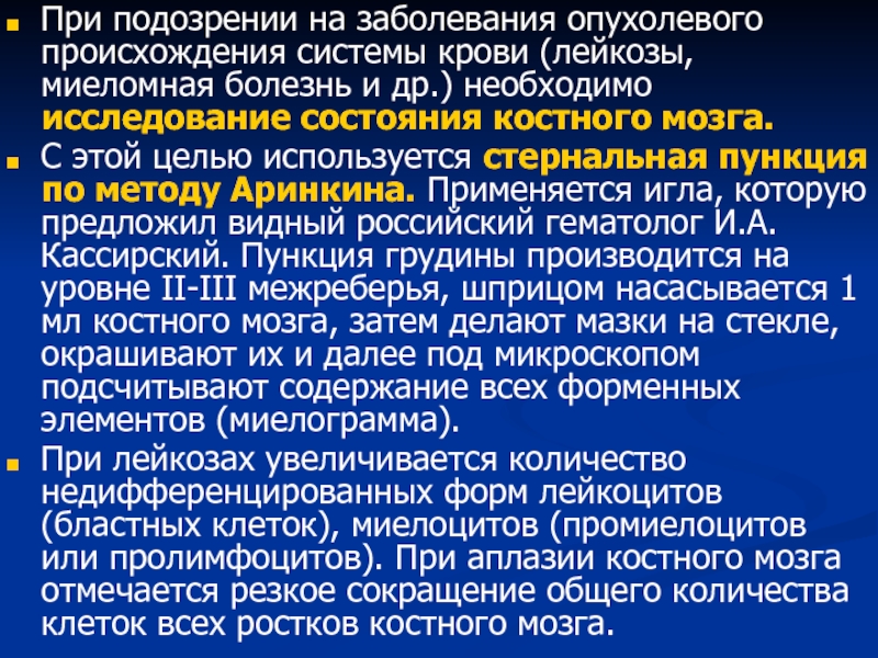Слайд 37При подозрении на заболевания опухолевого происхождения системы крови (лейкозы, миеломная болезнь