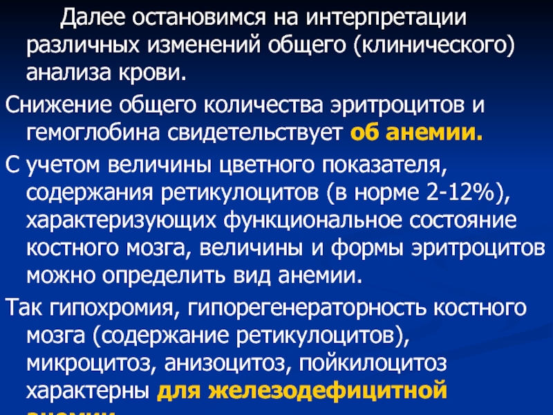 Слайд 27 Далее остановимся на интерпретации различных изменений общего (клинического) анализа крови.