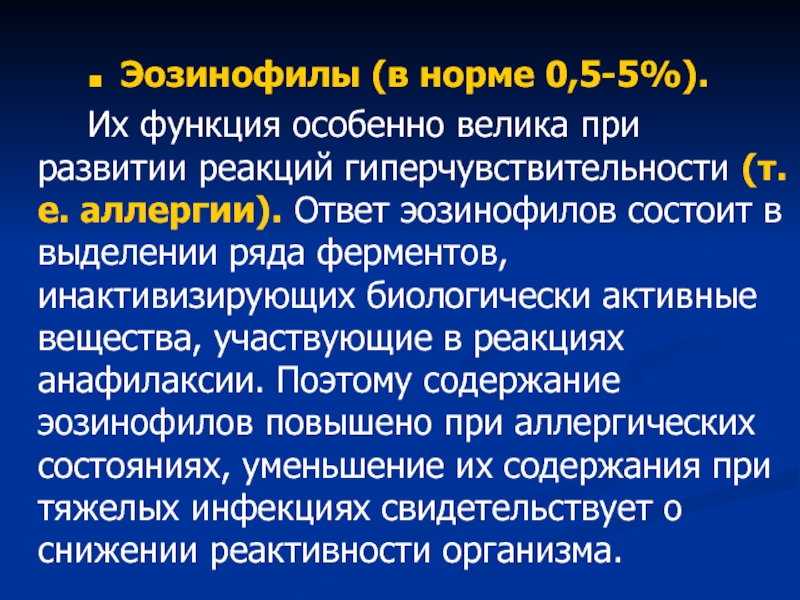гиперчувствительности (т.е. аллергии). Ответ эозинофилов состоит в выделении ряда ферментов, инактивизирующих биологически активные вещества, участвующие в реакциях анафилаксии. Поэтому содержание эозинофилов повышено при аллергических состояниях, уменьшение их содержания при тяжелых инфекциях свидетельствует о снижении реактивности организма.