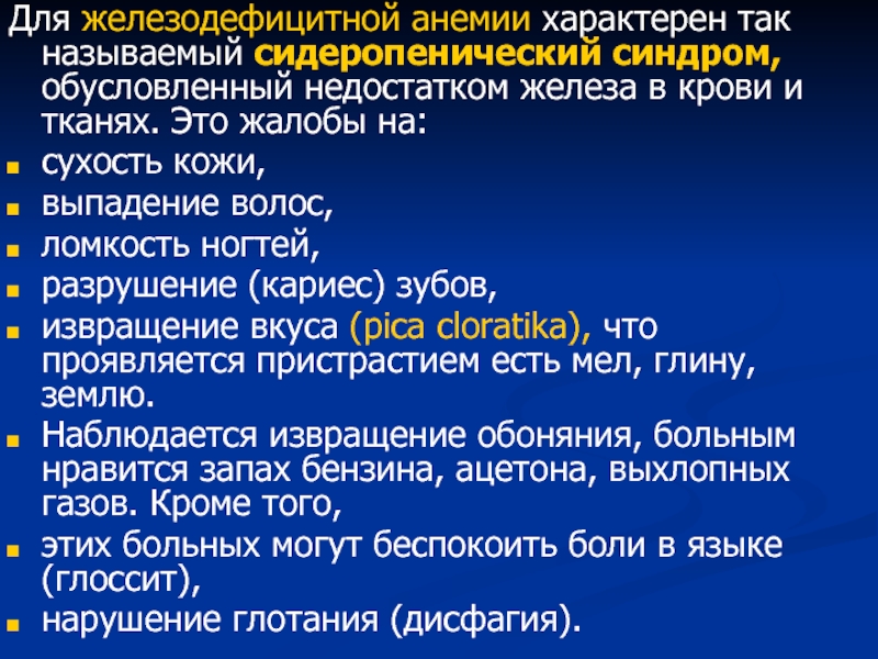 Слайд 10Для железодефицитной анемии характерен так называемый сидеропенический синдром, обусловленный недостатком железа
