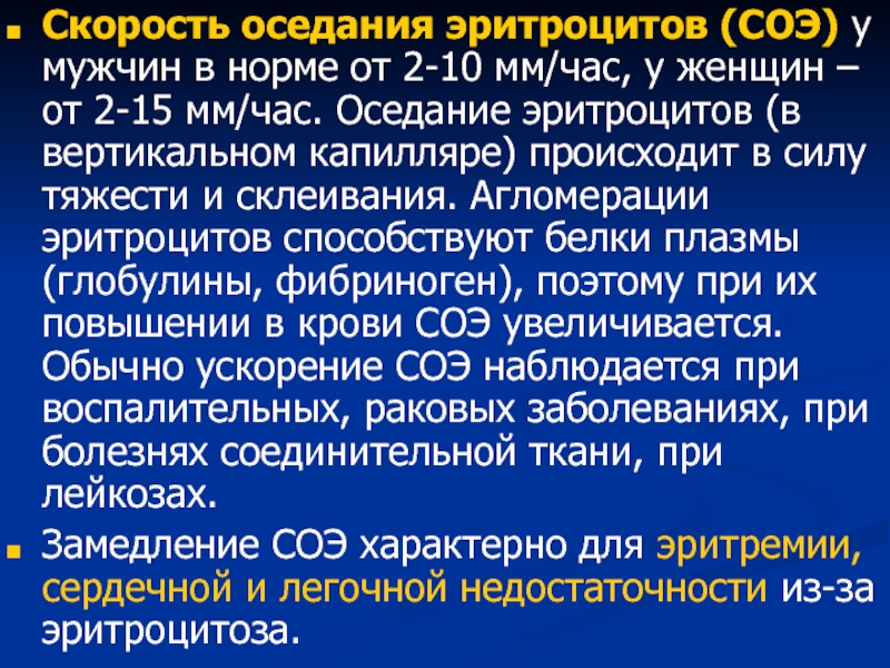 у женщин – от 2-15 мм/час. Оседание эритроцитов (в вертикальном капилляре) происходит в силу тяжести и склеивания. Агломерации эритроцитов способствуют белки плазмы (глобулины, фибриноген), поэтому при их повышении в крови СОЭ увеличивается. Обычно ускорение СОЭ наблюдается при воспалительных, раковых заболеваниях, при болезнях соединительной ткани, при лейкозах.