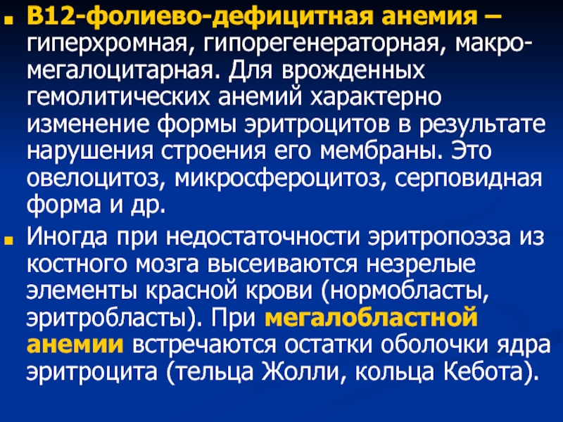 Слайд 28В12-фолиево-дефицитная анемия – гиперхромная, гипорегенераторная, макро-мегалоцитарная. Для врожденных гемолитических анемий характерно