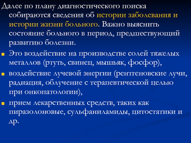 Слайд 12Далее по плану диагностического поиска собираются сведения об истории заболевания и