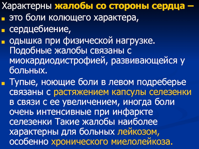 Тупые, ноющие боли в левом подреберье связаны с растяжением капсулы селезенки в связи с ее увеличением, иногда боли очень интенсивные при инфаркте селезенки Такие жалобы наиболее характерны для больных лейкозом, особенно хронического миелолейкоза.