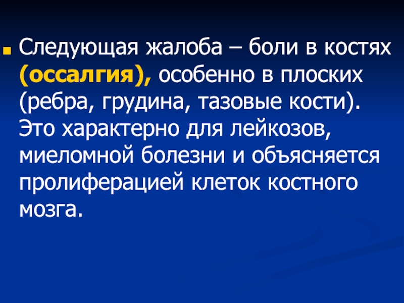 грудина, тазовые кости). Это характерно для лейкозов, миеломной болезни и объясняется пролиферацией клеток костного мозга.
