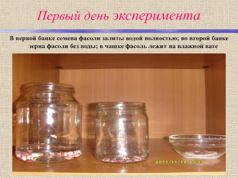 В первой банке семена фасоли залиты водой полностью; во
