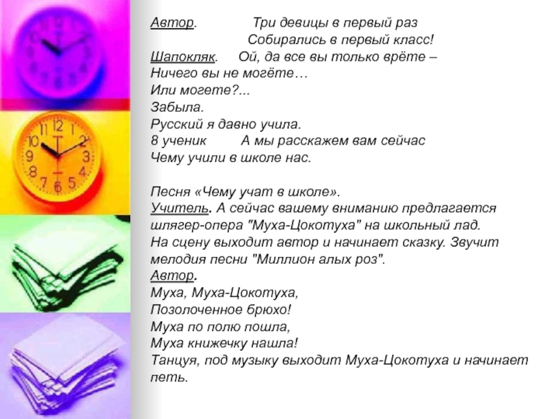 Учитель. А сейчас вашему вниманию предлагается шлягер-опера "Муха-Цокотуха" на школьный лад.