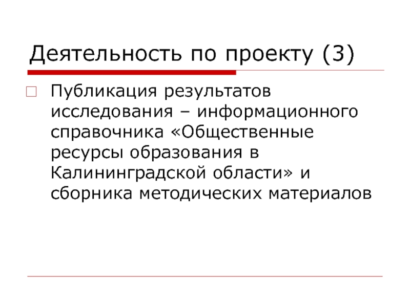 учреждений образования и НКО; обобщение, оценка и презентация имеющегося опыта и методических разработок, ресурсов и потребностей школ в области трёхстороннего сотрудничества; организация консультирования и обучения руководителей и педагогов учреждений образования и НКО по выбранным направлениям; организация серии семинаров в Калининграде и районах области по следующим направлениям – сотрудничество школы и общественной организации, методические инновации, внутришкольная демократизация)