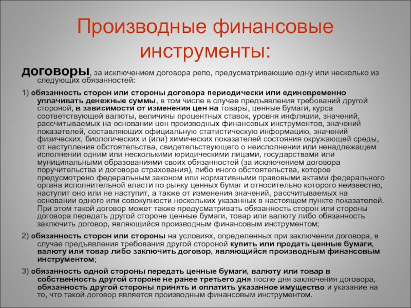 1) обязанность сторон или стороны договора периодически или единовременно уплачивать денежные суммы, в том числе в случае предъявления требований другой стороной, в зависимости от изменения цен на товары, ценные бумаги, курса соответствующей валюты, величины процентных ставок, уровня инфляции, значений, рассчитываемых на основании цен производных финансовых инструментов, значений показателей, составляющих официальную статистическую информацию, значений физических, биологических и (или) химических показателей состояния окружающей среды, от наступления обстоятельства, свидетельствующего о неисполнении или ненадлежащем исполнении одним или несколькими юридическими лицами, государствами или муниципальными образованиями своих обязанностей (за исключением договора поручительства и договора страхования), либо иного обстоятельства, которое предусмотрено федеральным законом или нормативными правовыми актами федерального органа исполнительной власти по рынку ценных бумаг и относительно которого неизвестно, наступит оно или не наступит, а также от изменения значений, рассчитываемых на основании одного или совокупности нескольких указанных в настоящем пункте показателей. При этом такой договор может также предусматривать обязанность сторон или стороны договора передать другой стороне ценные бумаги, товар или валюту либо обязанность заключить договор, являющийся производным финансовым инструментом;