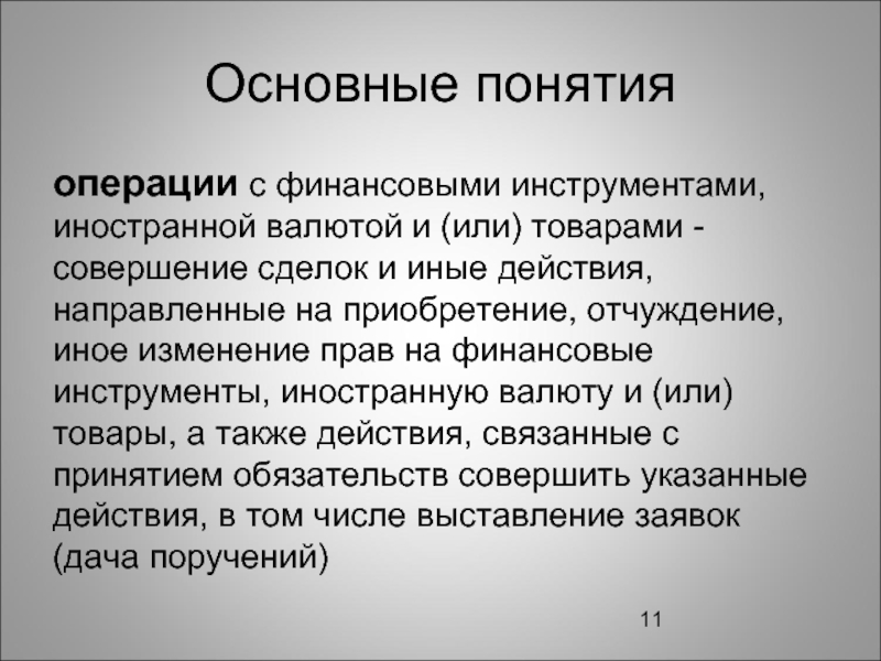 совершение сделок и иные действия, направленные на приобретение, отчуждение, иное изменение прав на финансовые инструменты, иностранную валюту и (или) товары, а также действия, связанные с принятием обязательств совершить указанные действия, в том числе выставление заявок (дача поручений)