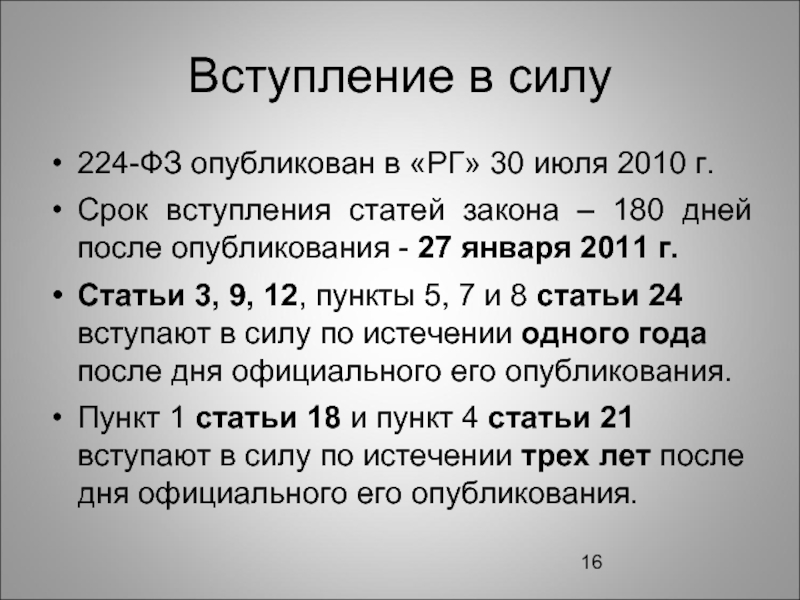 Статьи 3, 9, 12, пункты 5, 7 и 8 статьи 24 вступают в силу по истечении одного года после дня официального его опубликования.