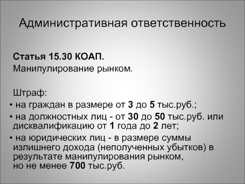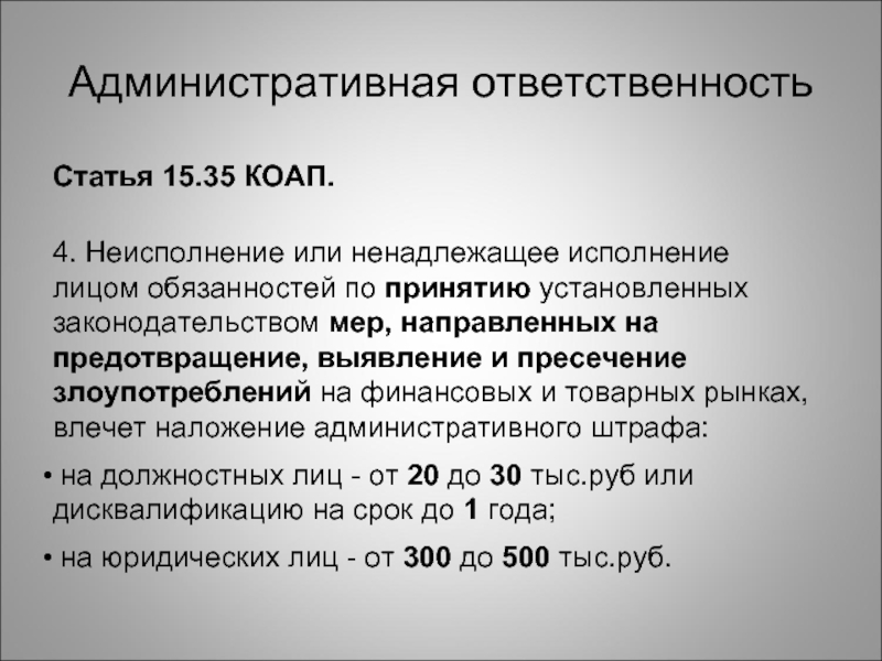 принятию установленных законодательством мер, направленных на предотвращение, выявление и пресечение злоупотреблений на финансовых и товарных рынках, влечет наложение административного штрафа:
