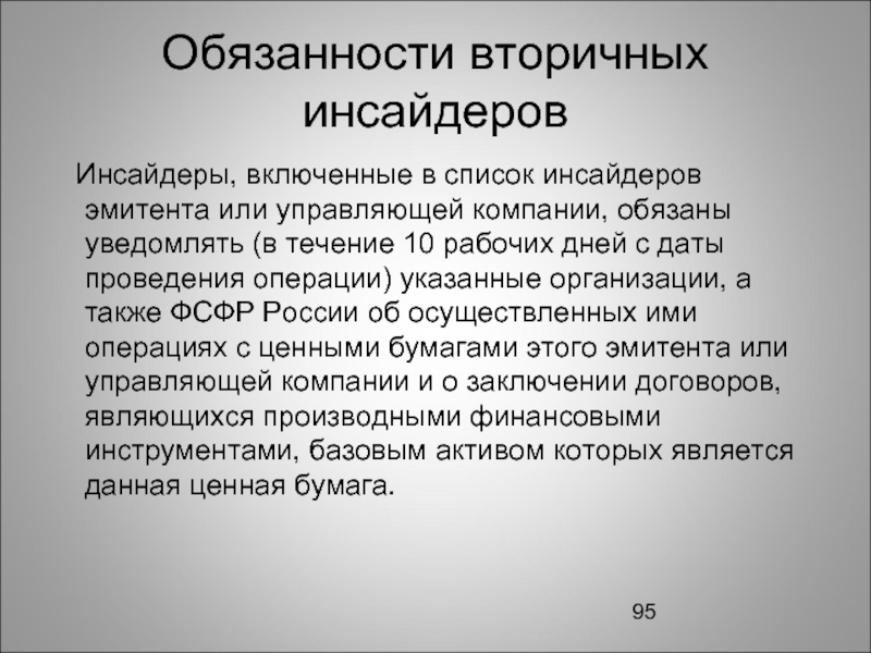 управляющей компании, обязаны уведомлять (в течение 10 рабочих дней с даты проведения операции) указанные организации, а также ФСФР России об осуществленных ими операциях с ценными бумагами этого эмитента или управляющей компании и о заключении договоров, являющихся производными финансовыми инструментами, базовым активом которых является данная ценная бумага.