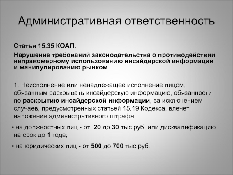 1. Неисполнение или ненадлежащее исполнение лицом, обязанным раскрывать инсайдерскую информацию, обязанности по раскрытию инсайдерской информации, за исключением случаев, предусмотренных статьей 15.19 Кодекса, влечет наложение административного штрафа:
