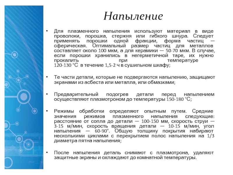 Режимы обработки определяют опытным путем. Средние значения режимов плазменного напыления следующие: расстояние от сопла до детали — 100-150 мм, скорость струи — 3-15 м/мин, скорость вращения детали — 10-15 м/мин, угол напыления — 60-90°. Общую толщину покрытия набирают несколькими циклами с перекрытием полос напыления на 1/3 диаметра пятна напыления;