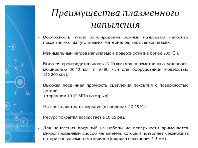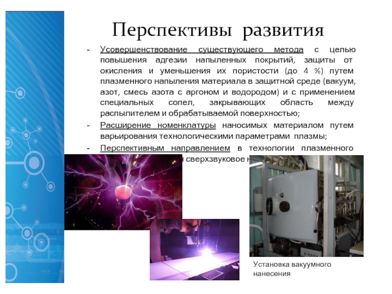 Расширение номенклатуры наносимых материалом путем варьирования технологическими параметрами плазмы;