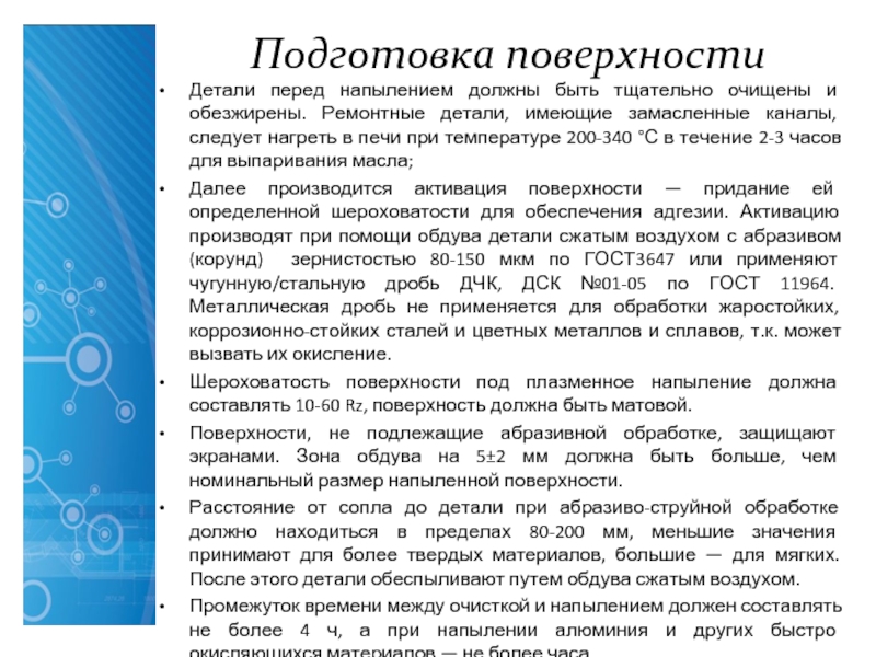 Шероховатость поверхности под плазменное напыление должна составлять 10-60 Rz, поверхность должна быть матовой.