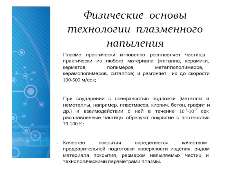 При соударении с поверхностью подложки (металлы и неметаллы, например, пластмасса, кирпич, бетон, графит и др.) и взаимодействии с ней в течение 10-4-10-7 сек расплавленные частицы образуют покрытие с плотностью 70-100 %;