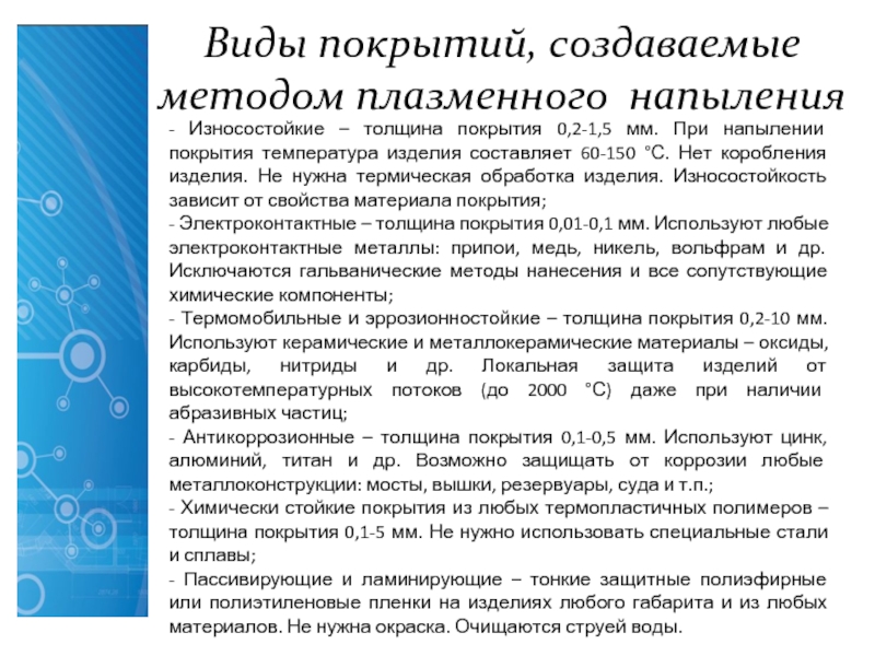Слайд 10Виды покрытий, создаваемые методом плазменного напыления