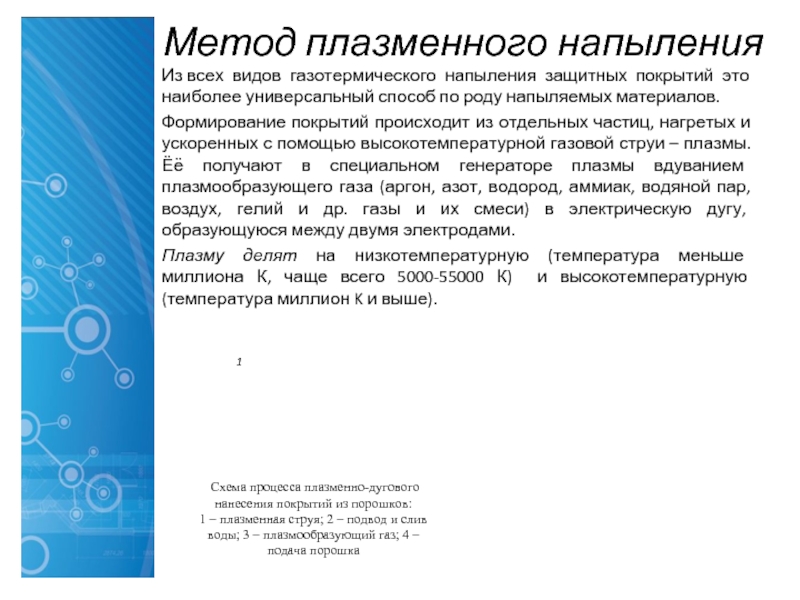 Формирование покрытий происходит из отдельных частиц, нагретых и ускоренных с помощью высокотемпературной газовой струи – плазмы. Ёё получают в специальном генераторе плазмы вдуванием плазмообразующего газа (аргон, азот, водород, аммиак, водяной пар, воздух, гелий и др. газы и их смеси) в электрическую дугу, образующуюся между двумя электродами.