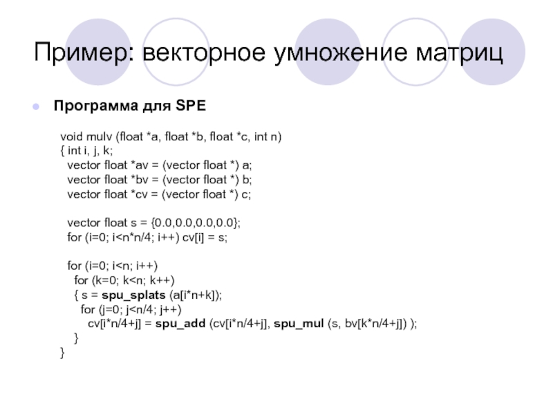 for (j=0; j    cv[i*n/4+j] = spu_add (cv[i*n/4+j], spu_mul (s, bv[k*n/4+j]) );