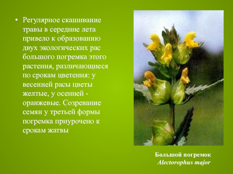 рас большого погремка этого растения, различающиеся по срокам цветения: у весенней расы цветы желтые, у осенней - оранжевые. Созревание семян у третьей формы погремка приурочено к срокам жатвы