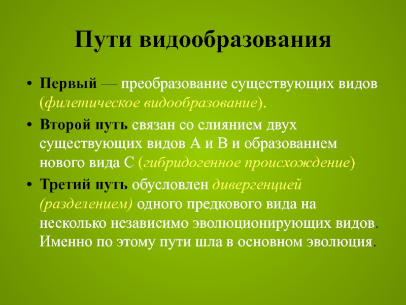 Слайд 6Первый — преобразование существующих видов (филетическое видообразование).