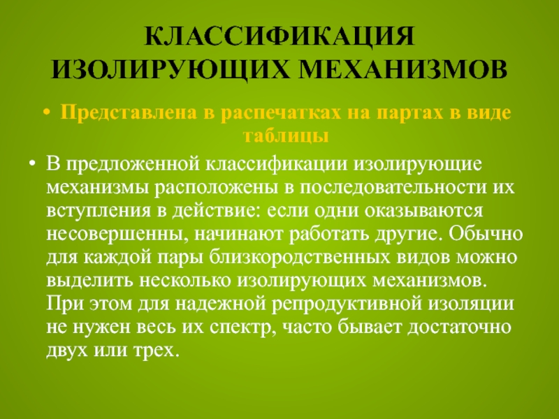классификации изолирующие механизмы расположены в последовательности их вступления в действие: если одни оказываются несовершенны, начинают работать другие. Обычно для каждой пары близкородственных видов можно выделить несколько изолирующих механизмов. При этом для надежной репродуктивной изоляции не нужен весь их спектр, часто бывает достаточно двух или трех.
