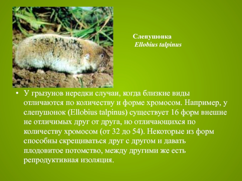 форме хромосом. Например, у слепушонок (Ellobius talpinus) существует 16 форм внешне не отличимых друг от друга, но отличающихся по количеству хромосом (от 32 до 54). Некоторые из форм способны скрещиваться друг с другом и давать плодовитое потомство, между другими же есть репродуктивная изоляция.
