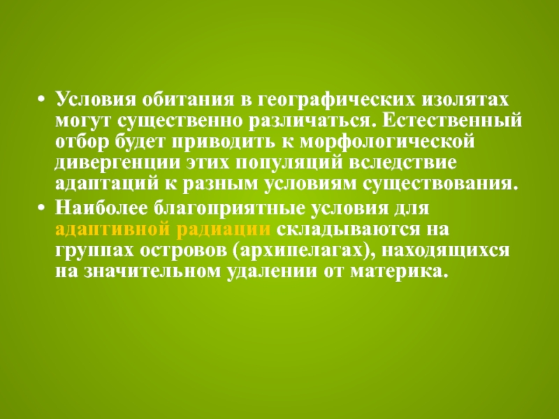 Наиболее благоприятные условия для адаптивной радиации складываются на группах островов (архипелагах), находящихся на значительном удалении от материка.