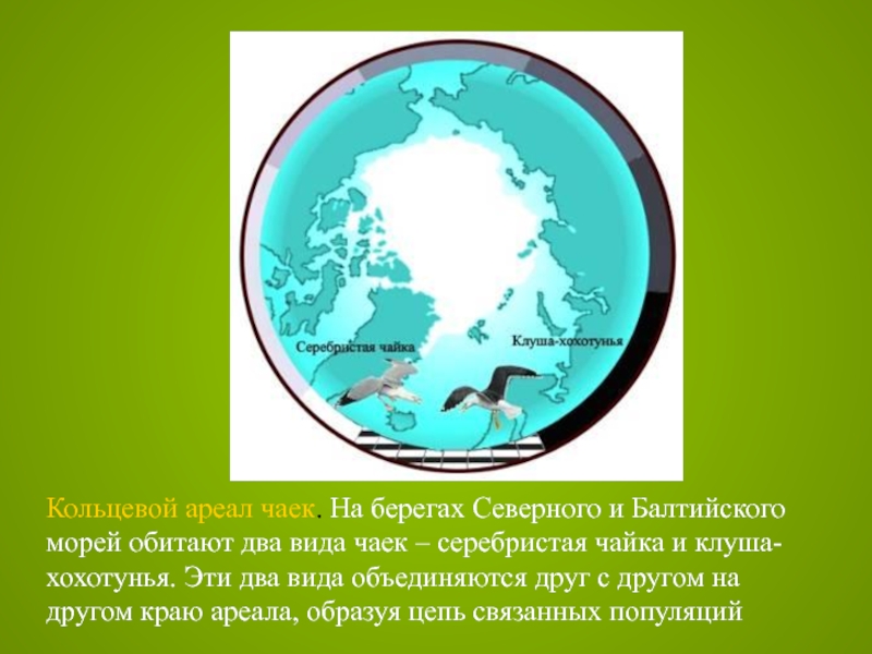 вида чаек – серебристая чайка и клуша-хохотунья. Эти два вида объединяются друг с другом на другом краю ареала, образуя цепь связанных популяций